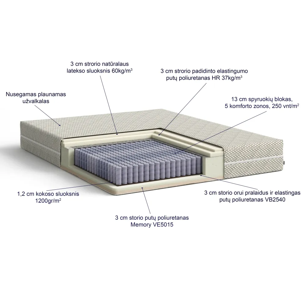Dvipusis čiužinys, viena pusė kieta, o kita pusė vidutinio kietumo. Čiužinys pagamintas laikantis aukštų kokybės standartų ir naudojant tik sertifikuotas žaliavas.