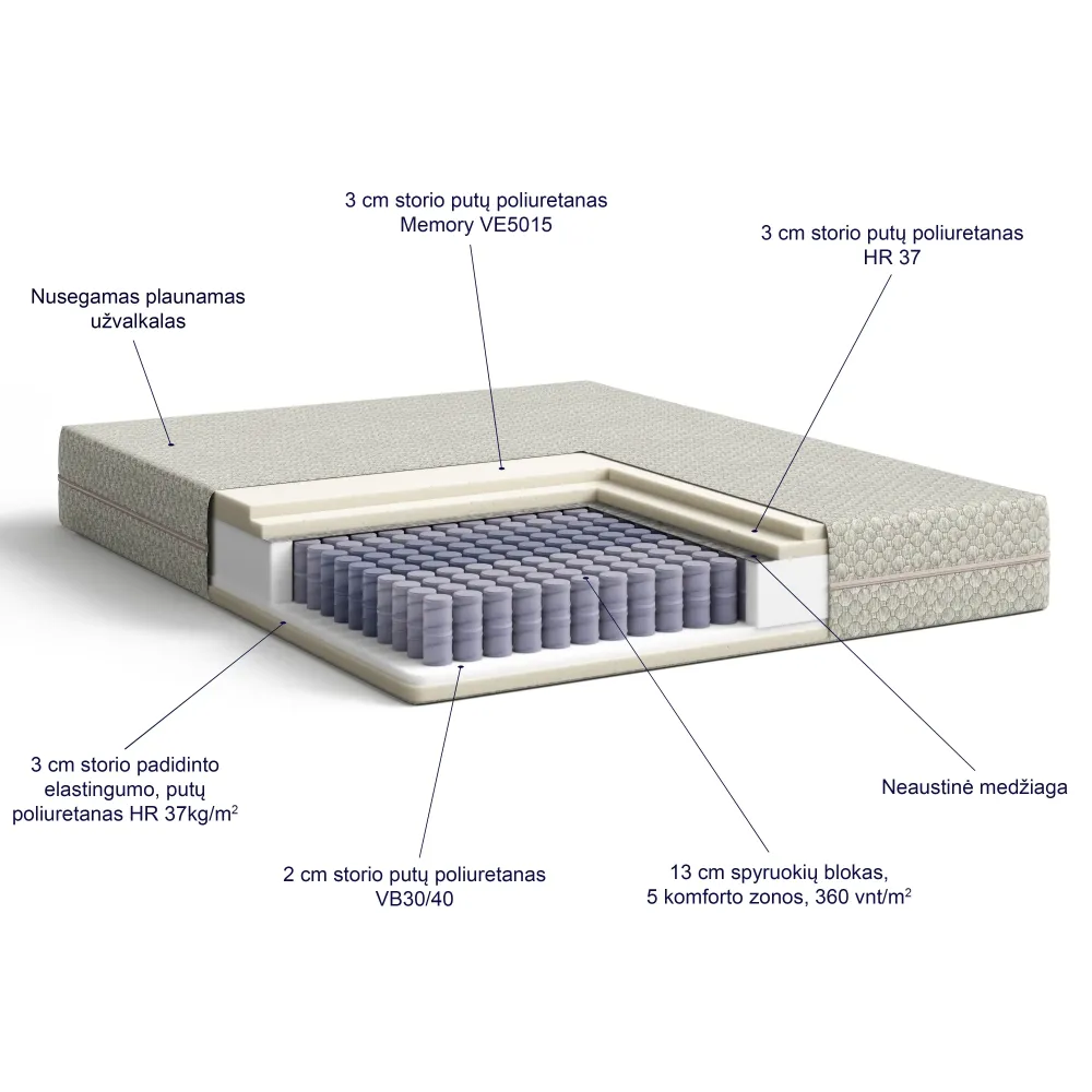 Dvipusis: vidutinio kietumo arba kietas | Spyruoklių blokas MULTI POCKET | Prisitaiko prie Jūsų kūno | Neperduoda partnerio judesių | Porolono Memory sluoksnis | Nusegamas skalbiamas užvalkalas | Kiekviena spyruoklė įvilkta į tekstilinius maišelius | 7 dydžiai: 90x200, 100x200, 120x200, 140x200, 160x200, 180x200, 200x200.