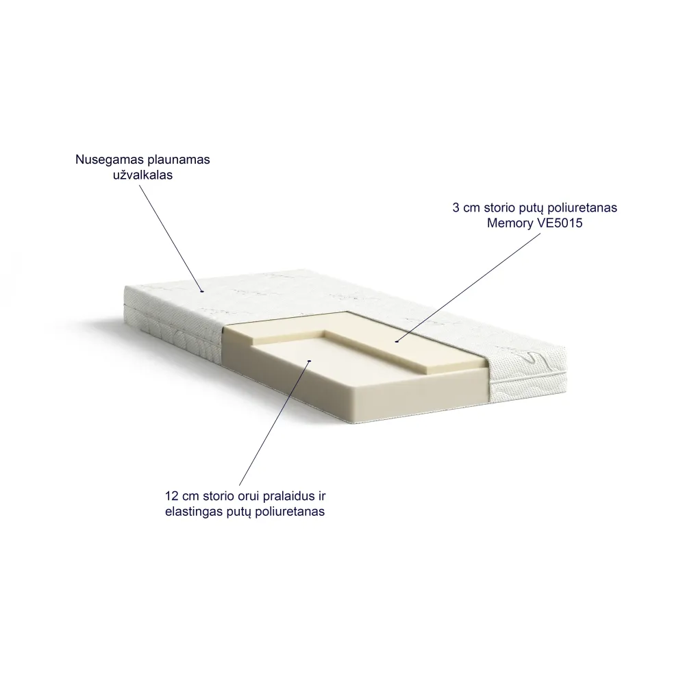 Vidutinio kietumo | Prisitaiko prie Jūsų kūno | Neperduoda judesių | Viskoelastinis putų poliuretanas Memory | Orui pralaidus ir elastingas putų poliuretanas | Nusegamas skalbiamas užvalkalas | 7 dydžiai: 90x200, 100x200, 120x200, 140x200, 160x200, 180x200, 200x200.