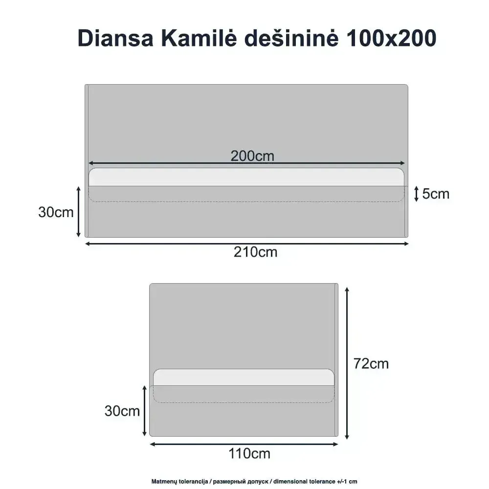 Lova Kamilė su patalynės dėže, čiužiniui 100x200. Dešininis kampas. Audinys Centauri 05 (nedraugiškas gyvūnams). Su papildoma nuimama sienelė nuo iškritimo. Parduodama kartu su vidutinio kietumo čiužiniu Comfy.