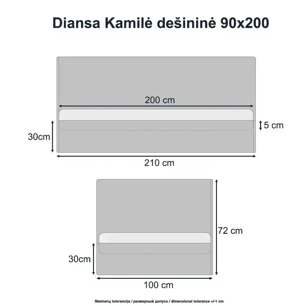 Lova Kamilė su patalynės dėže, čiužiniui 90x200. Dešininis kampas. Audinys Maloy 31 (nedraugiškas gyvūnams).