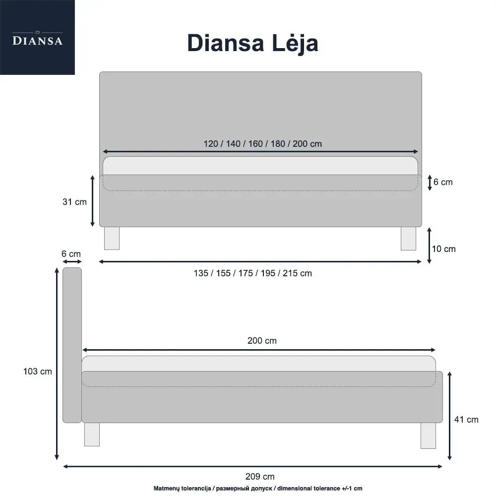Lova Lėja su patalynės dėže, čiužiniui 180x200. Audinys Avalon 01 (nedraugiškas gyvūnams). Parduodama kartu su vidutinio kietumo čiužiniu Comfy, jo aukštis 18 cm.