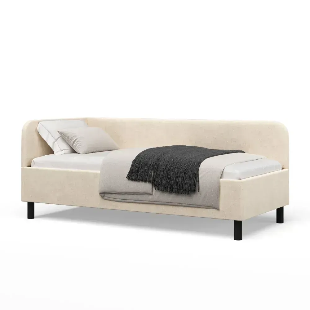 Lova Melita su patalynės dėže, čiužiniui 90x200. Dešininis kampas. Audinys Vinci 38 (nedraugiškas gyvūnams). Su papildoma nuimama sienelė nuo iškritimo. Parduodama kartu su vidutinio kietumo čiužiniu Comfy, jo aukštis 18 cm.