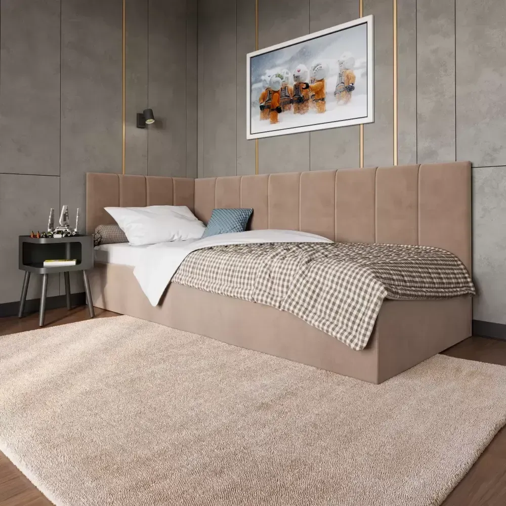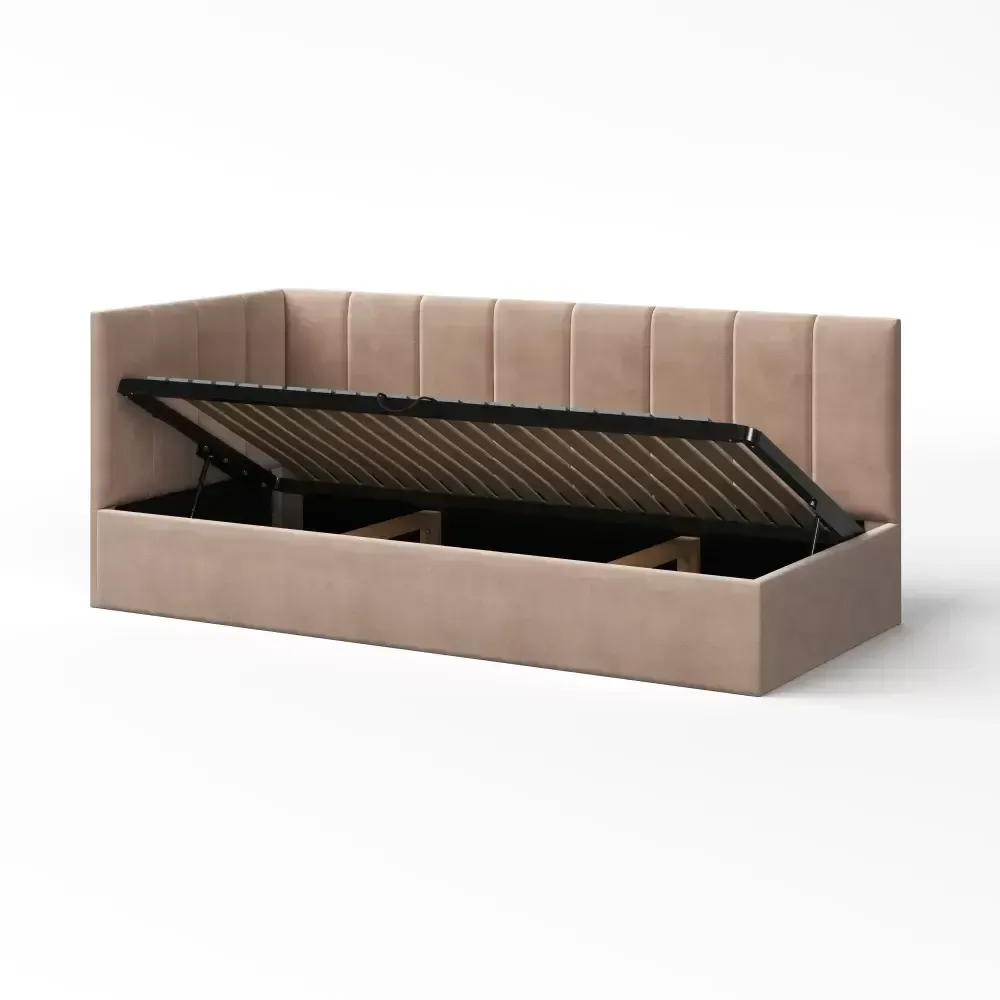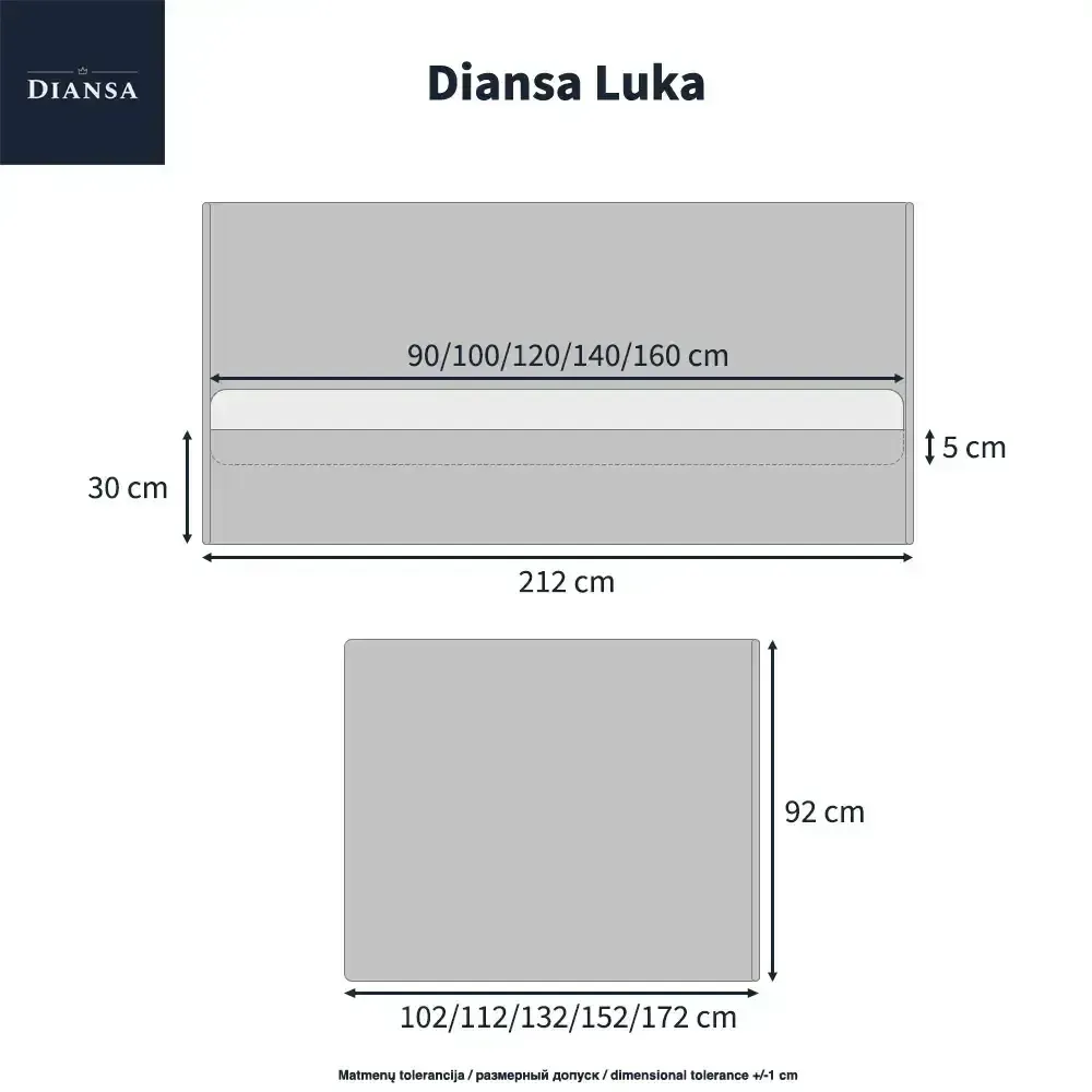 Lova Luka su patalynės dėže. Audinys Olympus 06. Lova pagaminta tik su galvūgaliu, be šoninės sienelės. Patalynės dėžė atsidaro iš kairės pusės (žiūrint iš kojūgalio). Yra surinkimo žymės.