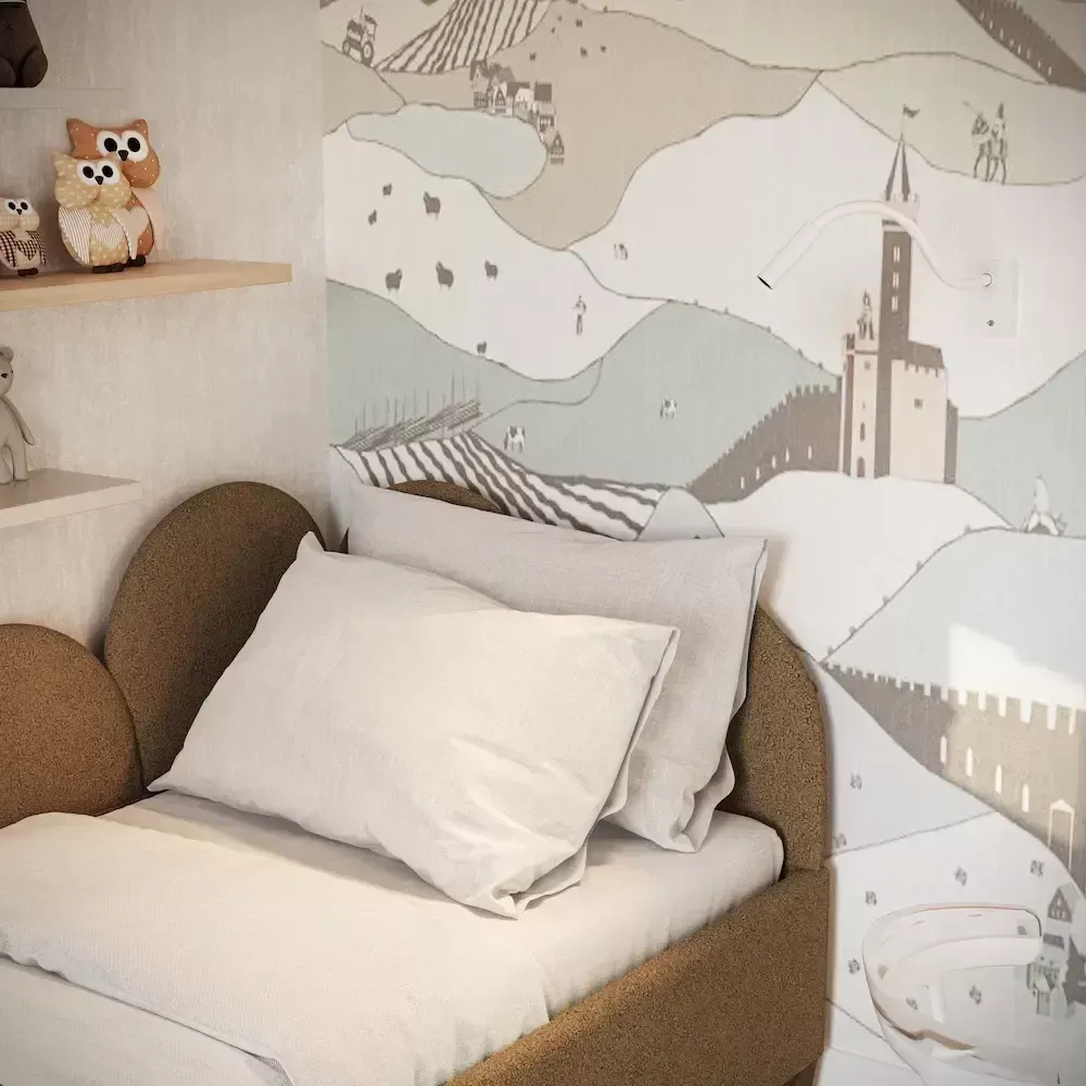 - Nugarinės galvūgalio ir šoninės sienelės dalys aptrauktos tokiu pat audiniu kaip lova.