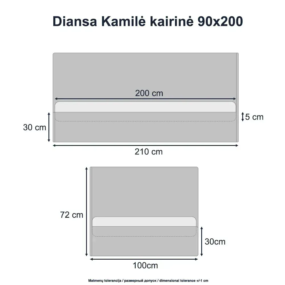 - Nugarinė galvūgalio dalis aptraukta tokiu pat audiniu kaip lova, šoninės sienelės nugarinė dalis aptraukta juoda medžiaga.