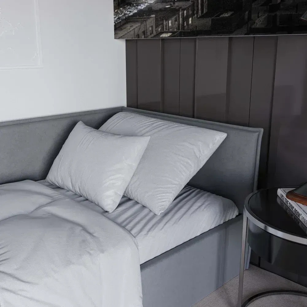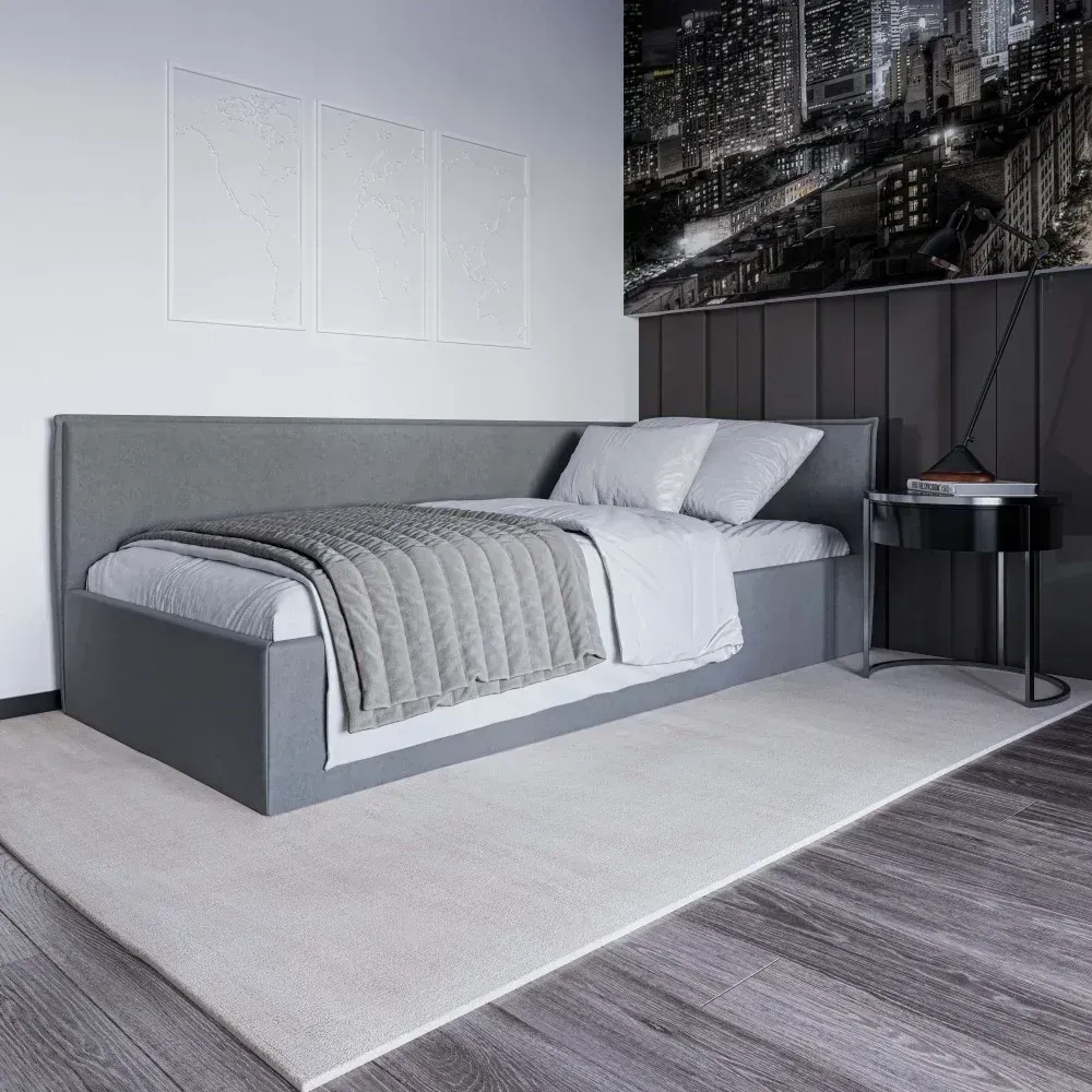 Kamilė išsiskiria savo moderniu dizainu. Apsiūtas lovos rėmas suteiks jaukumo ir prabangos interjerui. Galimas kairinis, dešininis kampas arba U forma. Papildomai galima užsakyti nuimamą apsauginę sienelę nuo iškritimo.