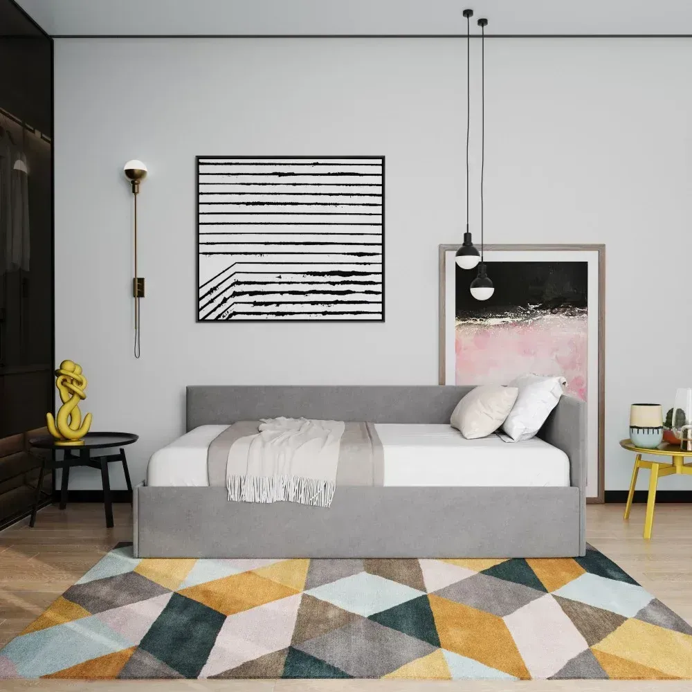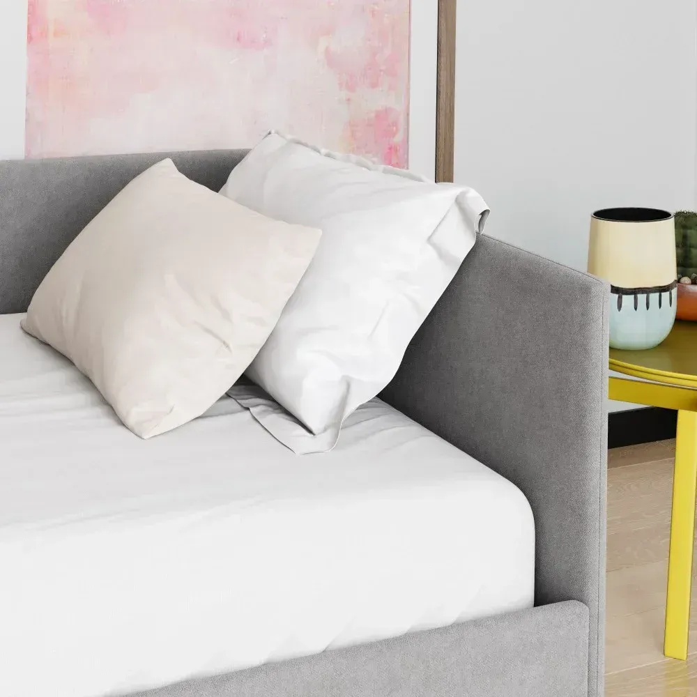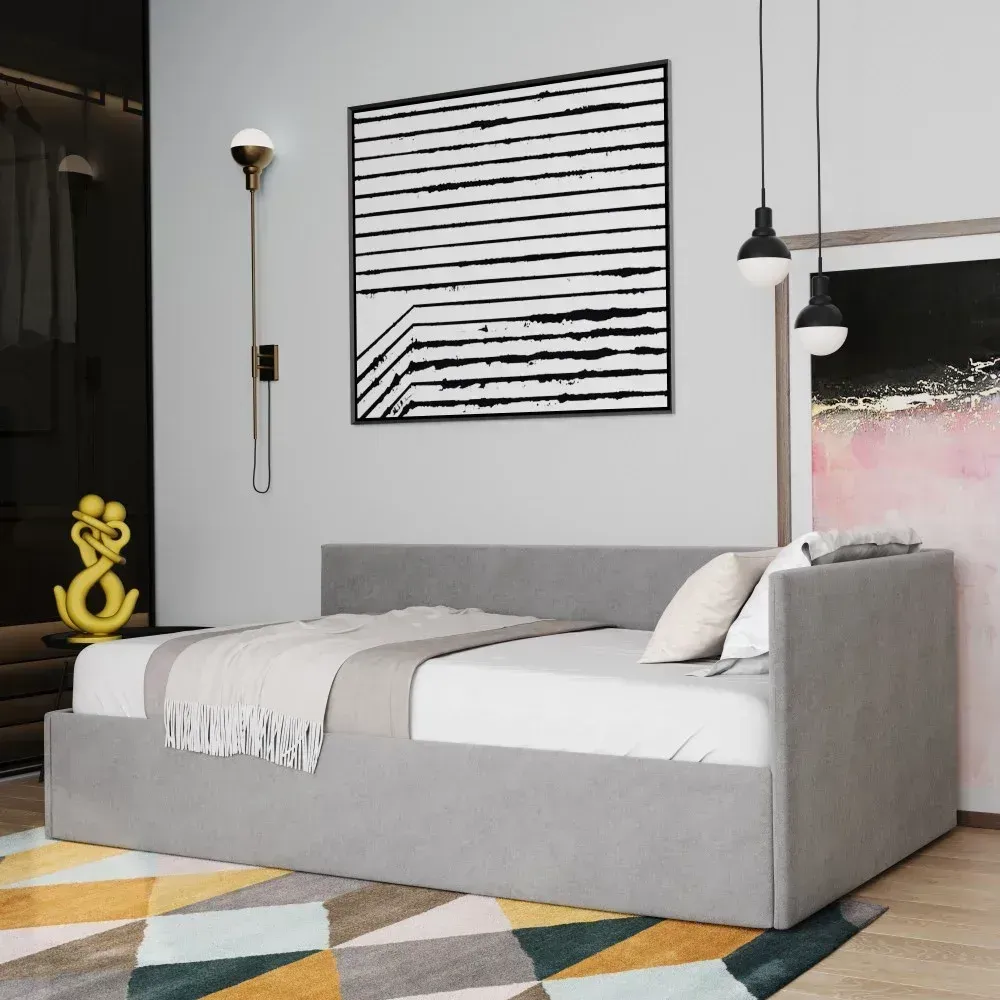 Modernaus dizaino lova, apsiūta kokybišku lengvai prižiūrimu audiniu. Galimas kairinis, dešininis kampas arba U forma. Papildomai galima užsakyti nuimamą apsauginę sienelę nuo iškritimo.