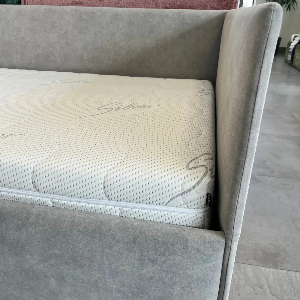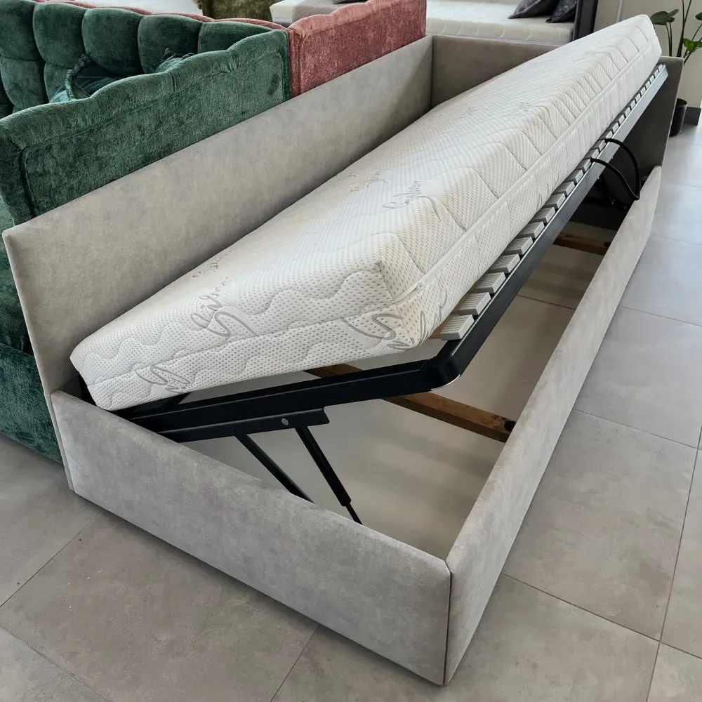Lova Stela su patalynės dėže, čiužiniui 90x200. Kairinis kampas. Audinys Cloud 83 (lengvai valomas. Lova iš ekspozicijos, turi surinkimo žymių.